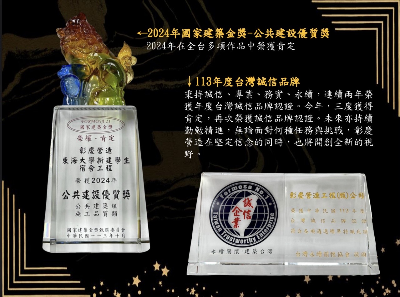 2024年榮獲雙冠王:國家建築金獎、台灣誠信品牌認證